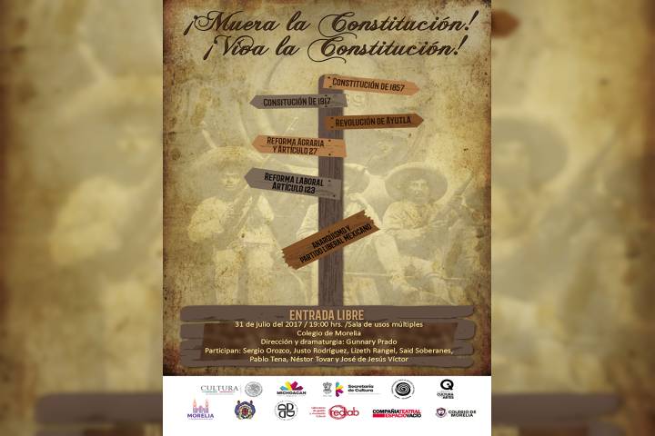 NOTICIAS 28/07/2017Espacio Vacío Teatro invita a la función especial de "Muera la Constitución Viva la Constitución"El teatro histórico tendrá un escaparate el siguiente lunes 31 de julio, ya que el montaje "Muera la Constitución, Viva la Constitución", de la compañía Espacio Vacío, será presentada en el Colegio de Morelia (antiguo Poliforum Digital), con entrada libre.