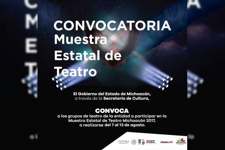 NOTICIAS 30/06/2017Secum lanza convocatoria para la Muestra Estatal de TeatroCon el fin de seleccionar al grupo teatral que represente a Michoacán en la Muestra Regional de Teatro Zona Centro Occidente, el Gobierno del Estado de Michoacán a través de la Secretaría de Cultura, convoca a grupos de teatro de la entidad a participar en la Muestra Estatal de Teatro de Michoacán, a realizarse del 7 al 13 de agosto, el cuál será un espacio que fomente el intercambio, la reflexión y actualización de los creadores escéni... Ver más...