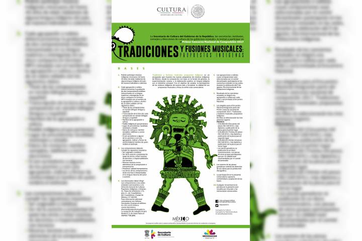 NOTICIAS 07/06/2017Convocan a indígenas a participar en el Primer Concurso Nacional de Composición Con el objetivo de ampliar la participación de los músicos indígenas de nuestro país y fortalecer la calidad de sus propuestas musicales y líricas, la Secretaría de Cultura del Gobierno de la República, las secretarías, institutos, consejos y direcciones de cultura de los Gobiernos Estatales, invitan a músicos indígenas mexicanos de hasta 40 años de edad, hablantes de alguna lengua indígena del país, de manera individual o colectiva,... Ver más...