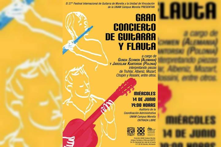 Como parte de las actividades del Festival Internacional de Guitarra, la Unidad de Vinculación de la UNAM Campus Morelia presentan un Gran Concierto de Guitarra y Flauta, este miércoles 14 de junio, a las 19:00 horas, en el Auditorio de la Coordinación Administrativa de la UNAM Campus Morelia, ubicado en la Antigua Carretera a Pátzcuaro No. 8701, Colonia Ex Hacienda San José de la Huerta, la entrada es gratuita.