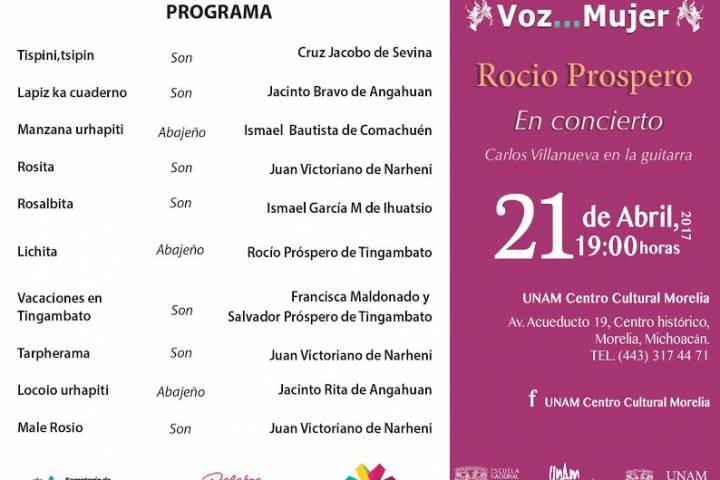 Como parte del ciclo de conciertos "Voz? Mujer", este viernes 21 de Abril, se presenta en la UNAM, Centro Cultural Morelia la intérprete de Pirekuas en lengua P´urhepecha de Michoacán, Rocío Prospero, evento que se realiza en conjunto con la Secretaría de Igualdad Sustantiva y Desarrollo de las Mujeres Michoacanas (Seimujer).