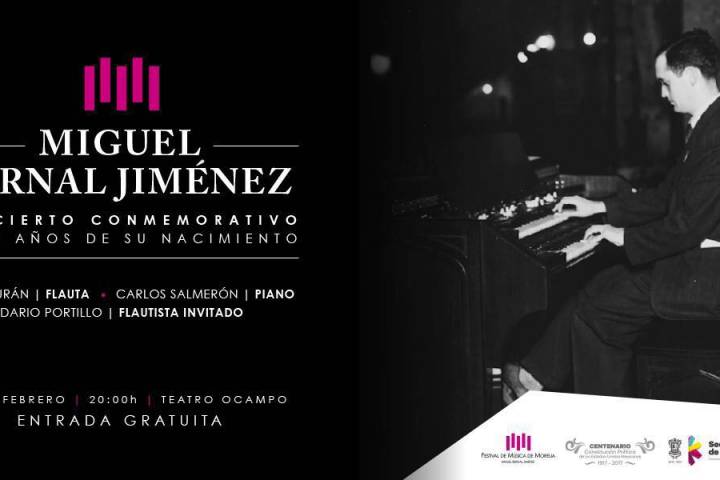 NOTICIAS 21/02/2017Mañana, concierto conmemorativo del natalicio de Miguel Bernal JiménezCon un concierto gratuito organizado por la Secretaría de Cultura del Estado de Michoacán (SECUM), y el Festival de Música de Morelia (FMM) Miguel Bernal Jiménez, se conmemorará el 107 aniversario del natalicio del compositor michoacano, Miguel Bernal Jiménez, el próximo 22 de febrero, en el Teatro Ocampo, a las 20:00 horas con entrada libre.