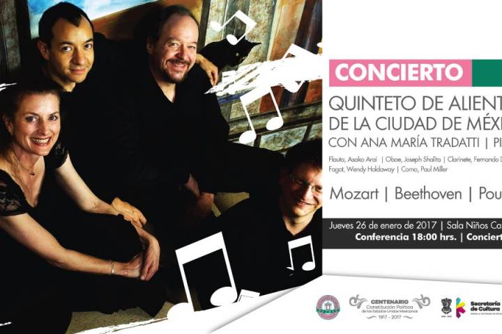 NOTICIAS 26/01/2017Hoy, Quinteto de Alientos de la Ciudad de México en el Conservatorio de las Rosas El Quinteto de Alientos de la Ciudad de México llega hoy a la capital del estado para ofrecer un concierto completamente gratuito en la Sala de Niños Cantores del Conservatorio de las Rosas. El quinteto se hará acompañar por Ana María Tradatti en el piano.