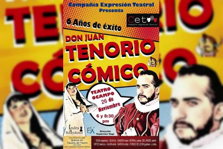 La Compañía Expresión Teatral (CET) regresa al Teatro Ocampo con la obra Don Juan Tenorio Cómico Michoacán 2016. El sábado 26 de noviembre habrá dos funciones de la divertida puesta en escena.