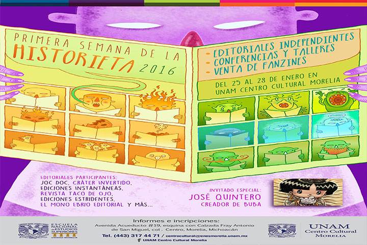 NOTICIAS 20/01/2016Primera Semana de la Historieta del 25 al 28 de enero La Primera Semana de la Historieta se llevará a cabo en la UNAM Centro Cultural los días 25, 26, 27 y 28 de enero del 2016. En ella participarán ocho conferencistas provenientes de distintas entidades del país, quienes además impartirán talleres y vendrán acompañados de sus editoriales para poder ofrecer al público la venta de diversas historietas.