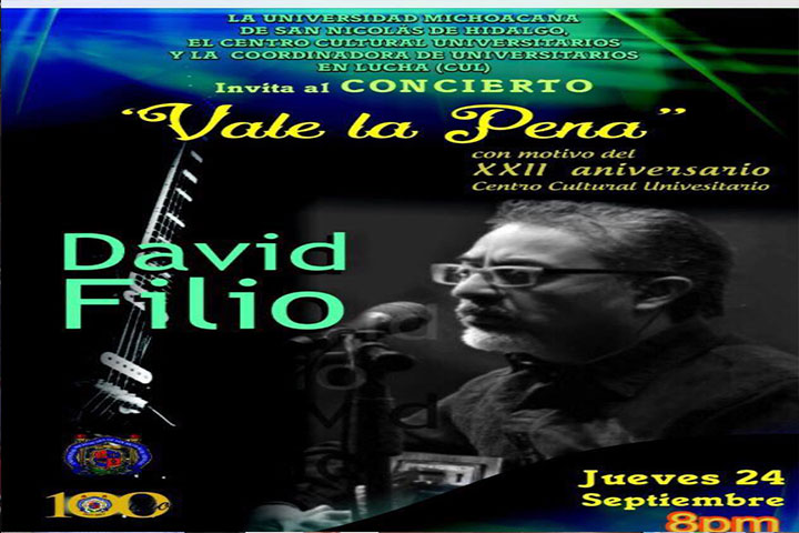 Con motivo del festejo por el XXII aniversario de la fundación del Centro Cultural Universitario (CCU) de la Universidad Michoacana de San Nicolás de Hidalgo (UMSNH), el próximo jueves 24 de septiembre el cantautor David Filio ofrecerá un concierto en el Auditorio de ese recinto, durante el cual hará la presentación de su tercer disco como solista que lleva por título "Vale la pena".