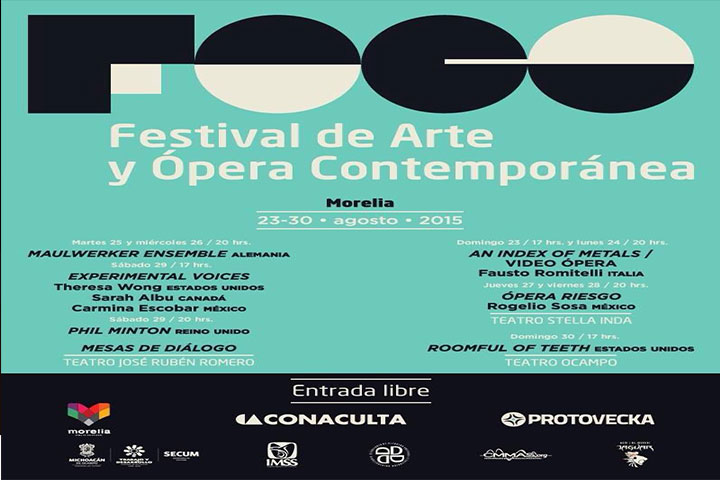 Por primera vez el público interesado en nuevas propuestas en la escena contemporánea y la experimentación vocal podrá disfrutar del Festival de Arte y Ópera Contemporánea (Foco) el cual se llevará a cabo del 23 al 30 de agosto en Morelia, Michoacán. Este evento es producido por la asociación Protovecka, apoyado por el Consejo Nacional para la Cultura y las Artes (Conaculta) y la iniciativa privada.