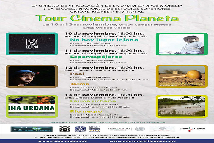 NOTICIAS 06/11/2014Tour Cinema Planeta está de regreso en la UNAM Campus Morelia Del lunes 10 al jueves 13 de noviembre vuelve a la UNAM Campus Morelia, el Tour Cinema Planeta, el Festival Internacional de Cine y Medio Ambiente.
