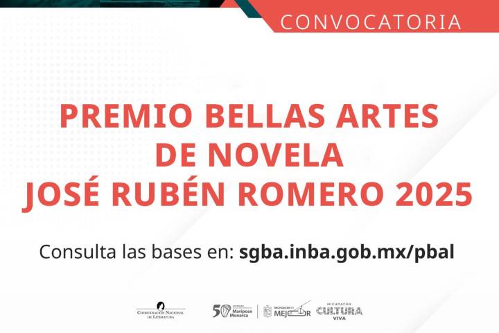 NOTICIAS 04/03/2025Abre Convocatoria para Premio Bellas Artes de Novela José Rubén Romero 2025La Secretaría de Cultura del Gobierno de México, el Instituto Nacional de Bellas Artes y Literatura (INBAL) y el Gobierno del Estado de Michoacán, a través de su Secretaría de Cultura, convocan al Premio Bellas Artes de Novela José Rubén Romero 2025. Este galardón tiene como propósito reconocer a las escritoras y escritores que destaquen en el ámbito de la novela. La convocatoria estará abierta hasta el 16 de mayo de 2025 a las 13:00 h... Ver más...