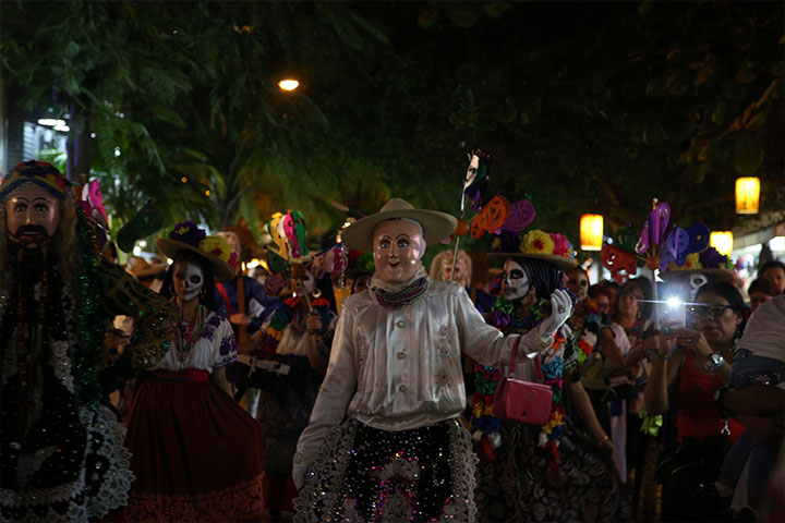 Mojigangas, medios rostros pintados de manera calavérica y cientos de personas entre niños, jóvenes y adultos, muchos ataviados a la usanza del baile de los viejitos de Carácuaro, participaron en el desfile efectuado en la 5ª Avenida en Playa del Carmen, cabecera del municipio de Solidaridad, en el marco del 9° Festival de Tradiciones de Vida y Muerte Xcaret 2014; evento en que el Ballet Folklórico de Michoacán y la Banda Real de Ichán... Ver más...