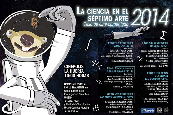 NOTICIAS 03/09/2014Este fin de semana inicia el ciclo de cine comentado "La Ciencia en el Séptimo Arte" Como parte de las actividades de divulgación que realizan en conjunto la Universidad Nacional Autónoma de México y la Universidad Michoacana de San Nicolás de Hidalgo, se realizará el ciclo de cine comentado "La Ciencia en el Séptimo Arte" en su edición 2014, a partir del sábado 6 de septiembre.