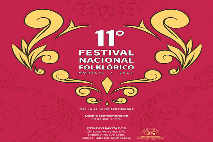 NOTICIAS 15/09/2014Anuncian 11° Festival Nacional Folclórico en el Centro de MoreliaCon la participación de 10 compañías folclóricas de diversos estados de la República y 8 compañías locales, se llevará a cabo el 11° Festival Nacional Folclórico 2014, del 19 al 28 de septiembre en la Cerrada de San Agustín y el Teatro Ocampo de Morelia.