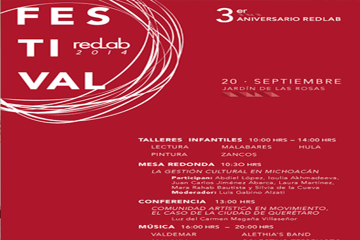 NOTICIAS 17/09/2014RedLab celebra Tercer Aniversario con Festival ArtísticoEste sábado 20 de septiembre en el Jardín de las Rosas, se llevará a cabo el Festival RedLab 2014, en el marco del tercer aniversario de la asociación dedicada a la gestión y vinculación cultural.