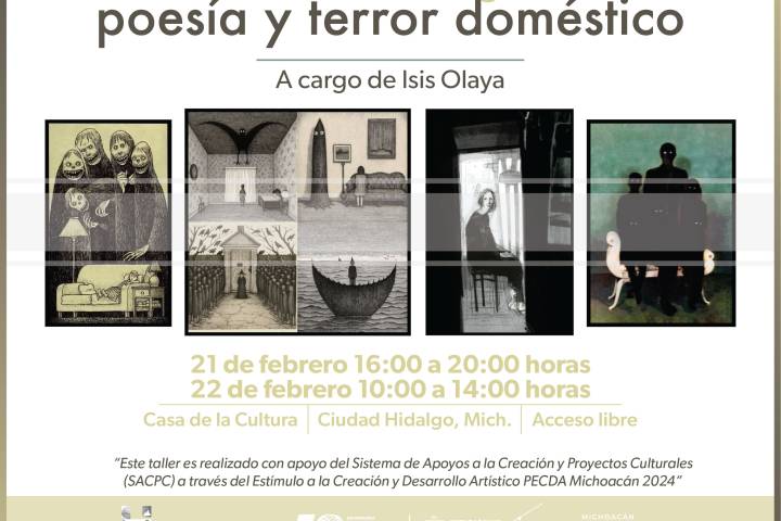NOTICIAS 17/02/2025Secum invita a taller literario sobre terror domésticoSi te interesa la escritura creativa y quieres explorar el terror doméstico desde una perspectiva literaria, la Secretaría de Cultura de Michoacán te invita al taller "Ecos del hogar: poesía y terror doméstico". Se llevará a cabo en la Casa de la Cultura del municipio de Hidalgo, el 21 de febrero de 16:00 a 20:00 horas y el 22 de febrero de 10:00 a 14:00 horas.