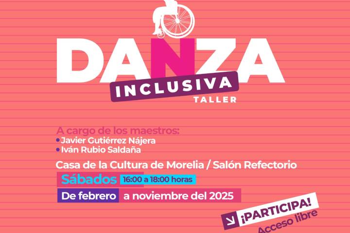 NOTICIAS 19/02/2025Taller de danza inclusiva gratuito para personas con discapacidad: Secum La Secretaría de Cultura de Michoacán (Secum) invita a adolescentes y adultos con discapacidad a participar en su taller gratuito de danza inclusiva, que se impartirá en la Casa de la Cultura de Morelia de febrero a noviembre.