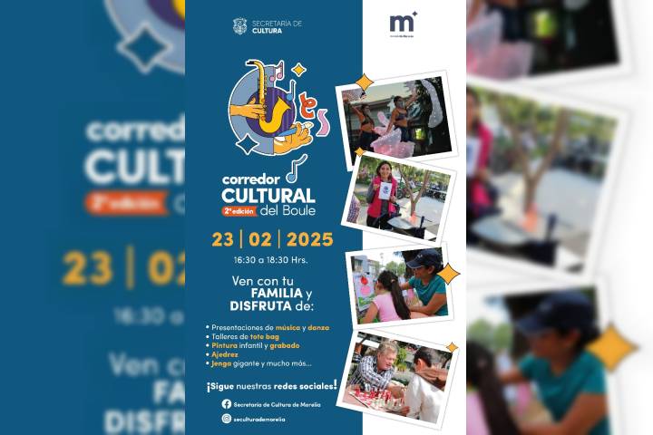 NOTICIAS 22/02/2025Disfruta de la música, danza y talleres este domingo en el Corredor Cultural del Boule Este domingo el Boulevard García de León se llenará del talento local de artistas y talleristas que participarán en la segunda edición del "Corredor Cultural", una actividad que organiza el Gobierno de Morelia encabezado por el Presidente Municipal, Alfonso Martínez Alcázar, con el objetivo de ofrecer a las y los ciudadanos un espacio recreativo y de convivencia familiar.