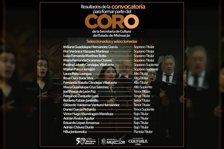NOTICIAS 25/02/2025Secum revela integrantes del Coro 2025 que representará a MichoacánLa Secretaría de Cultura de Michoacán (Secum) anunció a las y los integrantes de su Coro 2025, quienes representarán al estado en diferentes foros locales y nacionales a lo largo del año.