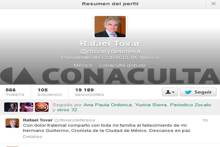 NOTICIAS 11/11/2013Muere el historiador Guillermo Tovar y de TeresaLa noticia del fallecimiento inesperado del cronista de la Ciudad de México, Guillermo Tovar y de Teresa, tocó darla a su hermano Rafael, presidente del Consejo Nacional para la Cultura y las Artes (Conaculta), y conmocionó de inmediato todos los ámbitos de la cultura mexicana por cuanto consiguió ser un hombre múltiple que, desde los 12 años, como asesor de la Presidencia de la República, asombró por su memoria y hambre de saber.