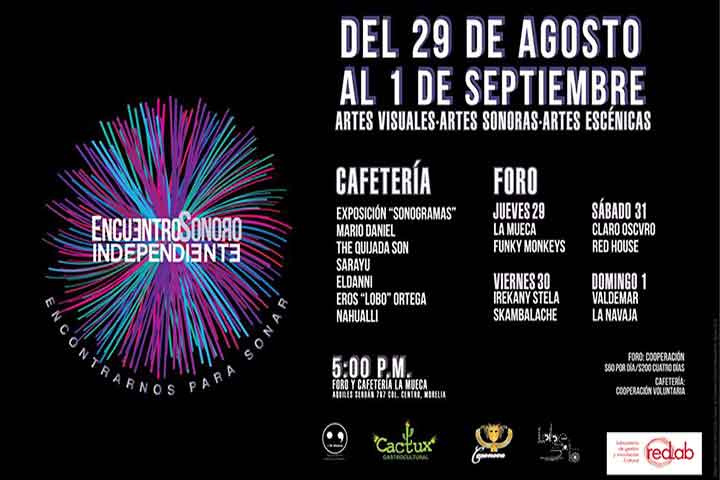 Encuentro que se genera en colaboración con La Mueca, Organización Mexicana de Arte, Cultura y Pensamiento para apoyar la producción y promoción de la música hecha por jóvenes de Morelia y del estado de Michoacán, con la meta de conformar una unidad autónoma de producción y difusión artística. Todo esto en conjunto con bandas tales como La Navaja, Skambalache, Claro Oscvro,Valdemar, Irekany Stela, La Mueca, Red House, The Quijada.son... Ver más...