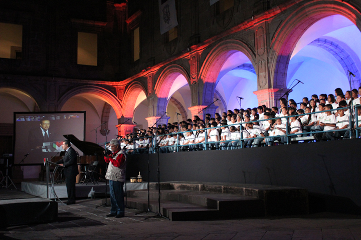 NOTICIAS 22/02/2013Niños de diversas colonias unen sus voces para un solo fin: la pazEl Centro Cultural Clavijero, uno de los espacios artísticos más importantes de la antigua Valladolid, abrió sus puertas al concierto titulado "Niños músicos por la paz", el cual llenó de un ambiente único al recinto histórico que sirvió de marco perfecto para que los más de 400 pequeños intérpretes, cantarán nueve melodías ante más de mil 500 asistentes.