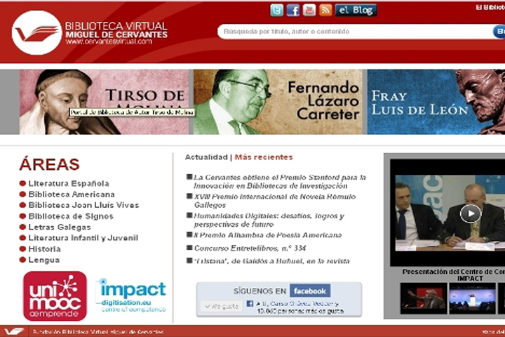 NOTICIAS 26/02/2013Premian a la Biblioteca Virtual Miguel de Cervantes por sus contenidosLa Biblioteca Virtual Miguel de Cervantes y la Biblioteca Nacional de Francia han obtenido el Premio Stanford para la Innovación en Bibliotecas de Investigación (Spirl), mientras que la Universidad Griffith de Australia y la Biblioteca Pública de Nueva York han recibido menciones de mérito.