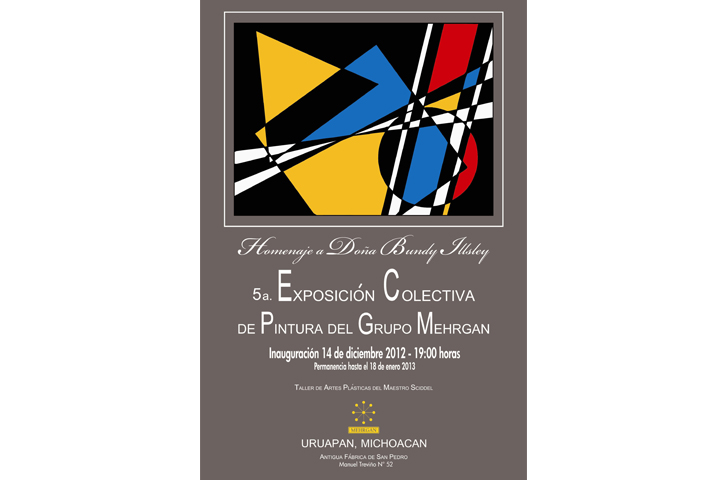 NOTICIAS 14/12/2012Exposición colectiva de Grupo "Mehrgan", en homenaje a Bundy IllseyCon su quinta exposición colectiva de pintura, a inaugurarse el 14 de diciembre a las 19:00 horas en la Antigua Fábrica de San Pedro, en Uruapan, el grupo Mehrgan rendirá un homenaje a Bundy Illsey, cuya familia ha brindado apoyo y protección a la agrupación artística.