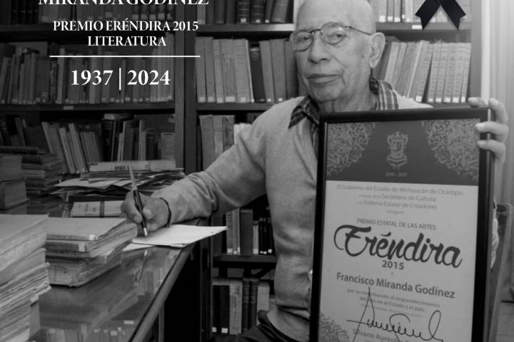 NOTICIAS 27/11/2024Secum rinde homenaje al docente e investigador Francisco Miranda GodÃnez ÂLa SecretarÃa de Cultura de Michoacán anuncia con profunda pena el fallecimiento de Francisco Miranda GodÃnez, docente e investigador originario de Yurécuaro, quien en 2015 fue condecorado con el Premio Estatal de las Artes Eréndira en la disciplina de Literatura y quien dedicó su trabajo al estudio y a la difusión de la literatura y la historia de Michoacán, en especial a la vida y la obra de Vasco de Quiroga.