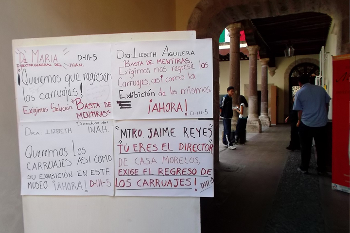 NOTICIAS 27/09/2012Trabajadores del "Museo Casa de Morelos" exigen al INAH regrese carruajes emblemáticos del lugarAtendiendo a las diversas denuncias de la sociedad en general que hicieron llegar a IM Noticias, el equipo de reporteros se dio a la tarea de investigar el hecho donde desde el 2009 ?según las versiones de empleados del lugar-, fueron llevados los dos carruajes que se localizaban en el sitio a Cuitzeo. Los visitantes al no saber la información oficial, pidieron a este portal investigar el caso.