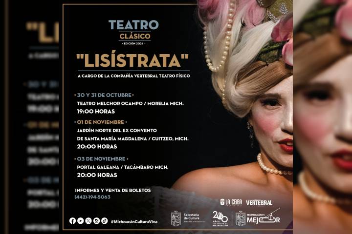 NOTICIAS 29/10/2024Lisístrata, la comedia griega que presentará la Secum en el OcampoEl miércoles 30 de octubre dará inicio en Morelia la gira de Lisístrata, una comedia griega de Aristófanes que dará vida la Compañía Vertebral Teatro Físico, ganadora de la convocatoria de Teatro Clásico, a cargo de la Secretaría de Cultura de Michoacán (Secum).