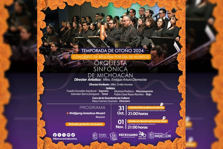 NOTICIAS 30/10/2024 Dará Osidem concierto especial por Noche de Ánimas en Morelia y Pátzcuaro Como ya es una tradición, la Secretaría de Cultura de Michoacán (Secum) te invita al concierto especial de Noche de Ánimas, a cargo de la Orquesta Sinfónica de Michoacán (Osidem) que deleitará al público con su Réquiem de Wolfgang Amadeus Mozart, en la Catedral Metropolitana de Morelia, el próximo 31 de octubre y en la Basílica de Nuestra Señora de la Salud, en Pátzcuaro, el 1 de noviembre. Ambos a las 21:00 horas, con acceso libre.... Ver más...