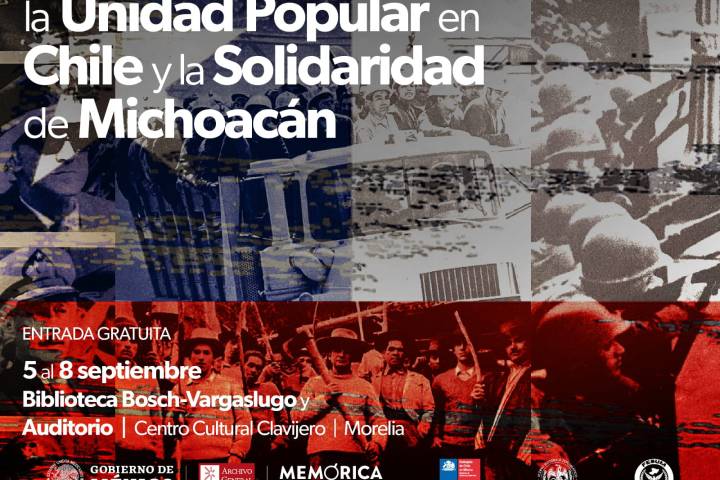 NOTICIAS 03/09/2024Con jornada conmemorativa, Michoacán refrendará lazos solidarios con ChileEste año se cumplen 54 años del triunfo de la unidad popular y 51 del golpe de estado en Chile, motivo por el cual, la Secretaría de Cultura de Michoacán (Secum) invita a la jornada conmemorativa, del 5 al 8 de septiembre, en las instalaciones del Centro Cultural Clavijero.