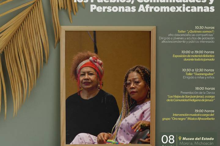 NOTICIAS 07/08/2024 La cultura afromexicana celebrará su día en el Museo del Estado La Secretaría de Cultura de Michoacán (Secum) ha organizado una serie de eventos para conmemorar el Día Nacional de los Pueblos, Comunidades y Personas Afromexicanas, el jueves 8 de agosto de 10:30 a 19:00 horas, en el Museo del Estado.