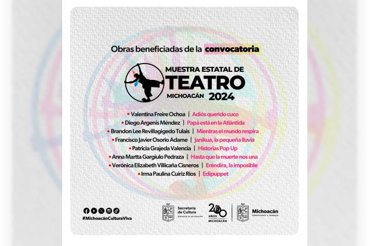 NOTICIAS 09/08/2024Secum da a conocer obras seleccionadas de la Muestra Estatal de Teatro 2024 La Secretaría de Cultura de Michoacán da a conocer los nombres de las obras seleccionadas que participarán en la Muestra Estatal de Teatro Michoacán, del 19 al 25 de agosto, con montajes que se presentarán en los teatros Stella Inda y Melchor Ocampo, en Morelia, así como en el Auditorio Municipal Samuel Ramos, en Zitácuaro.