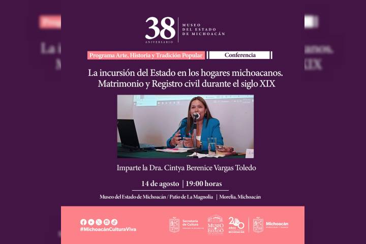 NOTICIAS 12/08/2024Conoce sobre el matrimonio y el Registro Civil en el siglo XIX en esta conferencia del Museo del EstadoPara este mes, la Secretaría de Cultura de Michoacán (Secum) tiene preparada una programación especial en el marco del 38 aniversario del Museo del Estado, en la que se encuentra la conferencia La incursión del Estado en los hogares michoacanos. Matrimonio y Registro civil durante el siglo XIX, el miércoles 14 de agosto a las 19:00 horas.
