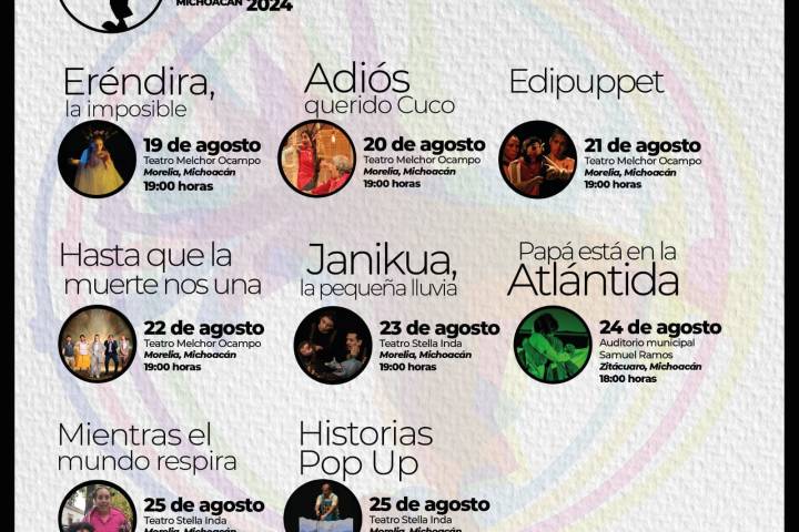 A las 19:00 horas, el teatro Melchor Ocampo será la sede de los montajes Eréndira, la imposible, que abrirá el telón el lunes 19 de agosto; Adiós querido Cuco, continuará el 20 de agosto; Edipuppet, el miércoles y Hasta q... Ver más...