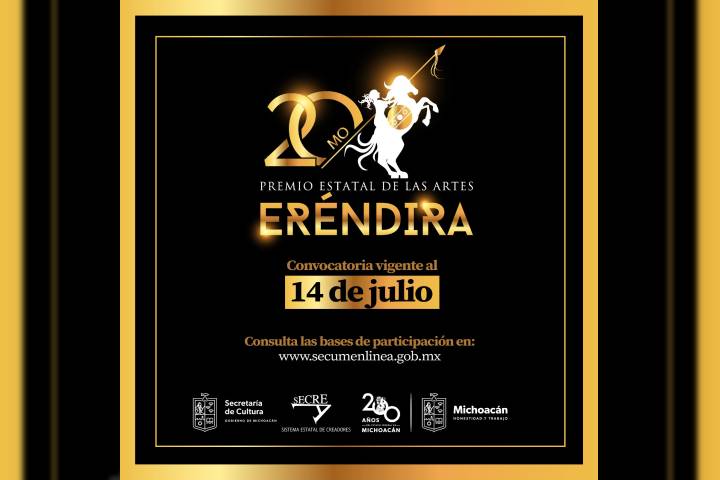 NOTICIAS 12/07/2024Por cerrar, convocatoria del Premio Eréndira 2024: SecumQuedan pocos dìas para que instituciones y asociaciones puedan postular a mujeres y hombres artistas con amplia trayectoria al Premio Estatal de las Artes Eréndira 2024. La fecha límite es este domingo 14 de julio.