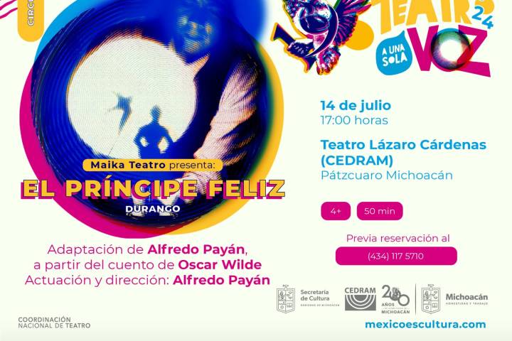 NOTICIAS 14/07/2024Dos obras de teatro imperdibles para este fin de semana en PátzcuaroEste fin de semana vive la experiencia del 19 Festival de Monólogos. Teatro a Una Sola Voz, en Michoacán. En el Centro Dramático de Michoacán (Cedram) de Pátzcuaro se presentarán los unipersonales Sabueso y El Príncipe Feliz.