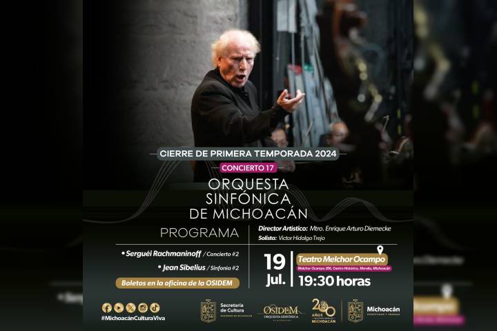 NOTICIAS 16/07/2024Vive el gran cierre de temporada de la Osidem en el Teatro OcampoLa Secretaría de Cultura de Michoacán (Secum) te invita a adquirir tus cortesías para el gran cierre de temporada de la Orquesta Sinfónica de Michoacán (Osidem), con el pianista Víctor Hidalgo Trejo como invitado especial. El concierto es este viernes 19 de julio, a las 19:30 horas.