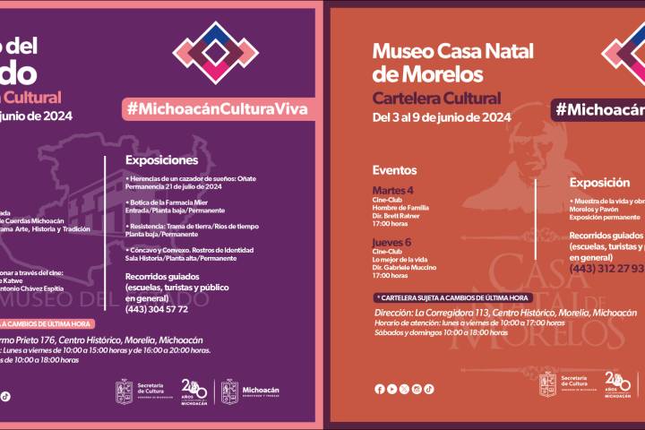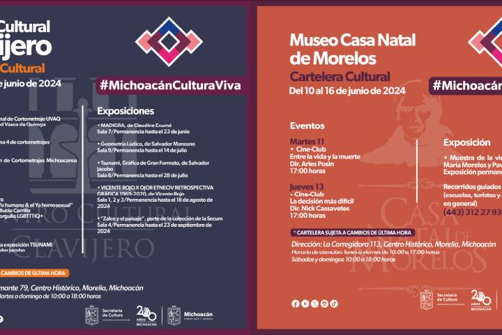 NOTICIAS 04/06/2024 Disfruta de una semana cultural con estos eventos de la Secum Te invitamos a que consultes la cartelera completa para que conozcas la serie de talleres y actividades que la Secretaría de Cultura de Michoacán (Secum) llevará a cabo del 3 al 9 de junio; entre ellos el Taller de Canto Tradicional purépecha Jorhénperanskua, este lunes 3, en la calle Morelos 18, en el Centro de Comachuén a las 16:00 horas.
