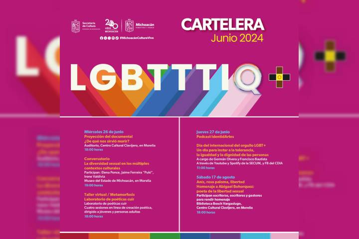 NOTICIAS 04/06/2024Presenta Secum actividades por el mes del orgullo LGBTTTIQ+Durante junio y agosto, la Secretaría de Cultura de Michoacán (Secum) realizará diversas actividades culturales para conmemorar el mes del orgullo LGBTTTIQ+, con el objetivo de promover y concientizar sobre el respeto, las luchas por los derechos y el reconocimiento de la diversidad sexual. Aquí te presentamos algunas de ellas.