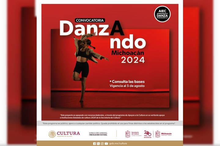 NOTICIAS 06/06/2024Presenta Secum convocatoria de danza; hay una bolsa de 257 mil pesosLa Secretaría de Cultura de Michoacán (Secum) invita a toda la comunidad dancística de la entidad a participar en el proceso de selección para integrar la programación del proyecto DanzAndo Michoacán 2024, que cuenta con una bolsa de 257 mil pesos y seleccionará a 9 compañías dancísticas.