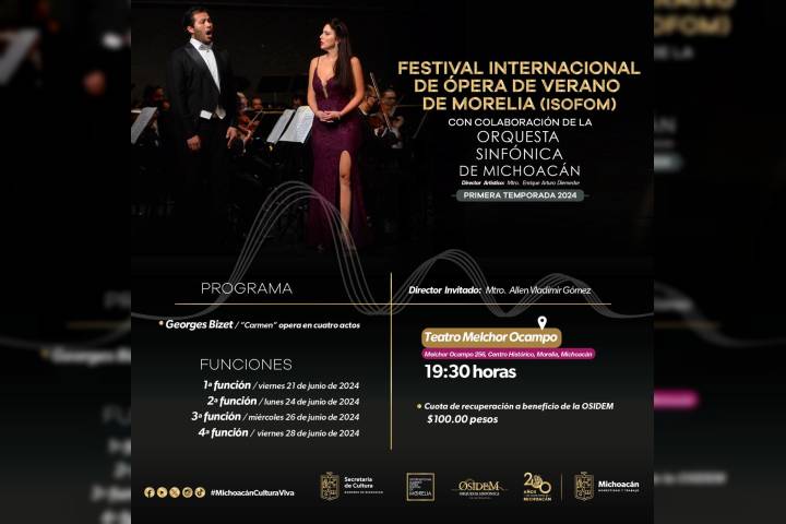 NOTICIAS 11/06/2024 Carmen, la ópera más representada en el mundo llegará al Teatro Ocampo La Secretaría de Cultura de Michoacán (Secum) te invita a las cuatro funciones de la ópera Carmen, de Georges Bizet, que se realizarán en el marco del Festival Internacional de Ópera de Verano de Morelia (ISOFOM), en colaboración de la Orquesta Sinfónica del Estado (Osidem) los días 21, 24, 26 y 28 de junio, a las 19:30 horas, en el Teatro Melchor Ocampo.