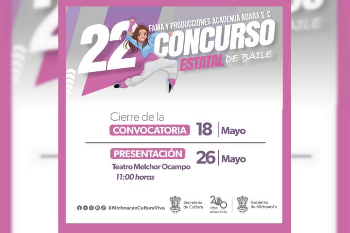 NOTICIAS 18/05/2024Mañana cierra convocatoria de danza Adara 2024: Secum  La SecretarÃa de Cultura invita a participar en el Concurso Estatal de Baile Adara 2024, el cual se realiza con la finalidad reunir al gremio de la danza de la ciudad de Morelia en sus diferentes géneros, en un intercambio de nuevas técnicas, asà como compartir un escenario con diversas propuestas coreográficas.