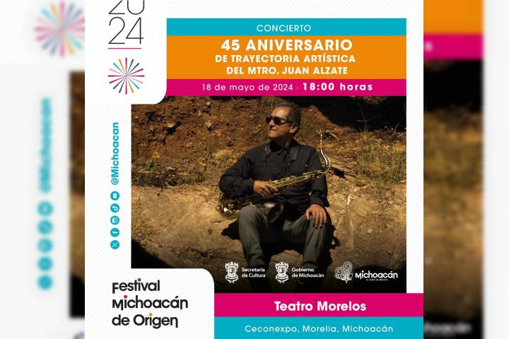 NOTICIAS 18/05/2024Celebra en el Festival de Origen los 45 años de carrera del saxofonista Juan AlzateCon su inseparable saxofón, el músico y compositor Juan Alzate cumplirá 45 años de trayectoria artÃstica, y qué mejor marco para hacerlo que el Festival Michoacán de Origen, en un evento que se llevará a cabo este sábado el 18 de mayo en el Teatro Morelos a las 18:00 horas, con su ensamble e invitados sorpresa.