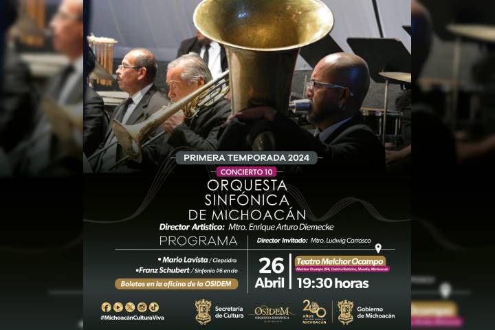 NOTICIAS 22/04/2024La Osidem ya está lista para su décimo concierto 2024  La Orquesta Sinfónica de Michoacán (OSIDEM) ya está lista para el décimo concierto de su primera temporada 2024, el cual ofrecerá en su sede el teatro Melchor Ocampo, el viernes 26 de abril a las 19:30 horas.