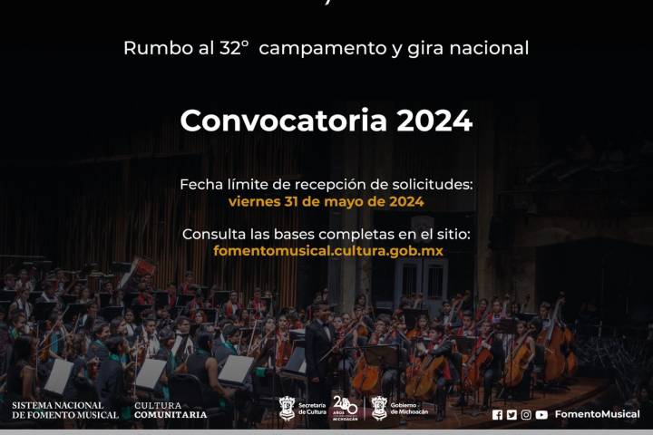 NOTICIAS 25/04/2024Abren convocatoria para participar en la Orquesta Sinfónica Infantil de MéxicoLa SecretarÃa de Cultura federal invita a niñas, niños y jóvenes mexicanos de entre ocho y 17 años que toquen algún instrumento musical a participar en el proceso de audición y selección para integrar la Orquesta Sinfónica Infantil de México (OSIM) 2024, que busca reunir un número aproximado de 130 ejecutantes, en el marco de la realización del 32 Campamento de Estudio y Gira Nacional de Conciertos de esta agrupación artÃstica.