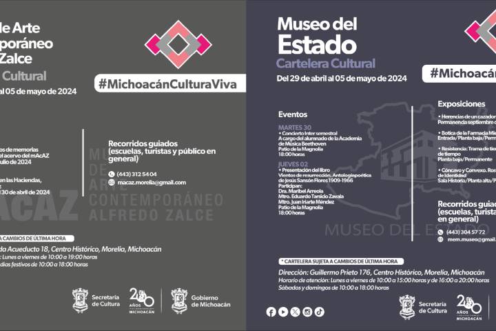 NOTICIAS 29/04/2024Vive la cultura en Michoacán con las actividades de la SecumVive la cultura en Michoacán y disfruta de todos los eventos que la SecretarÃa de Cultura del Estado (Secum) ha preparado para ti del 29 de abril al 5 de mayo.