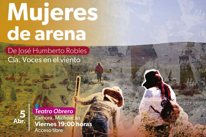 NOTICIAS 03/04/2024Mujeres de Arena, obra que retrata la desaparición forzada llega a Zamora La Secretaría de Cultura de Michoacán (Secum) invita a la población de Zamora y sus alrededores a la obra de teatro Mujeres de arena, que se presentará el viernes 5 de abril a las 19:00 horas en el Teatro Obrero, con acceso gratuito.