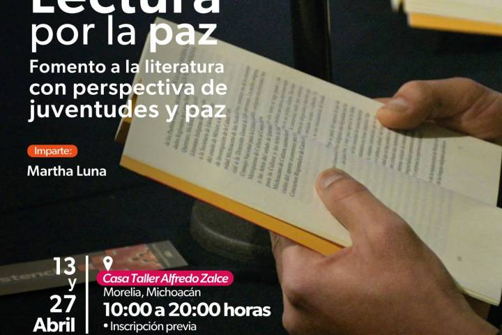 NOTICIAS 04/04/2024Inscríbete al taller de lectura por la paz en la Casa Taller Alfredo ZalceExisten un sinfín de caminos hacia la paz y la lectura es uno de ellos, por ello, la Secretaría de Cultura de Michoacán (Secum) te invita a que disfrutes del taller Lectura por la paz: fomento a la lectura con perspectiva de juventudes, a realizarse en la Casa Taller Alfredo Zalce los sábados 13 y 27 de abril.