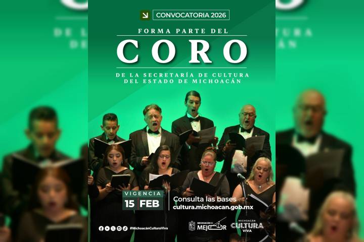 NOTICIAS 21/01/2026 ¿Eres cantante? Únete al Coro de la Secretaría de Cultura de Michoacán La Secretaría de Cultura de Michoacán (Secum) lanzó la convocatoria para integrar el coro de la institución, una agrupación de alto nivel artístico que representará al estado en distintos foros locales y nacionales durante 2026.